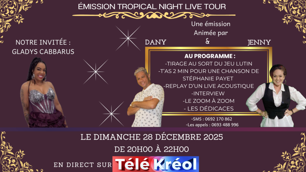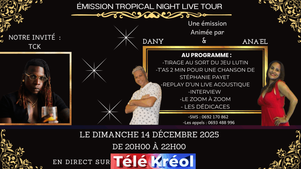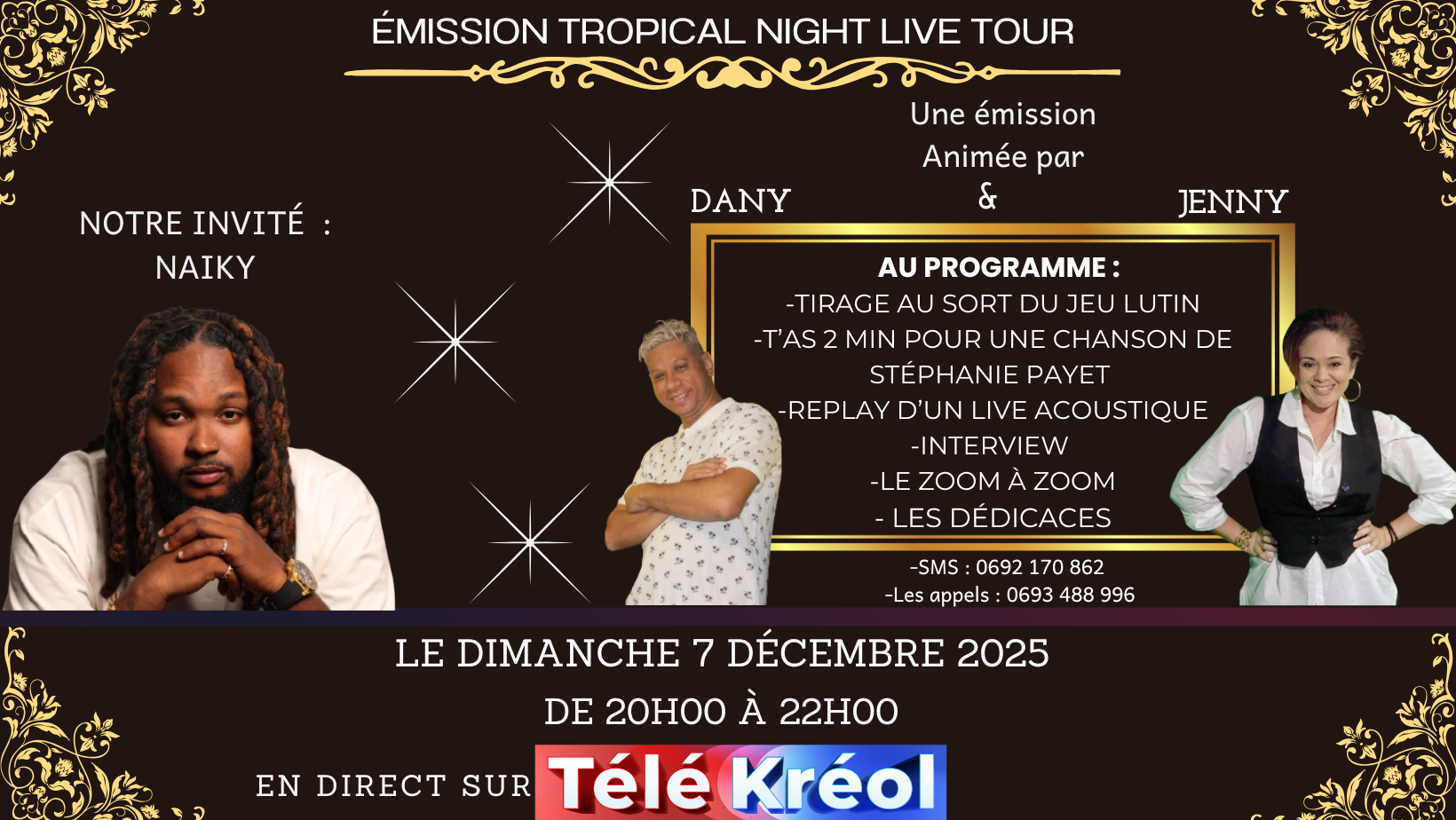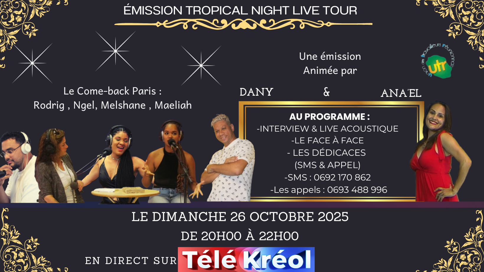 😍Retour en images dans Tropical Night Live Tour Emission du 17 août 2025, sur Télé Kréol, présentée par Dany et Erika & Jenny, depuis le studio de l’asso KILTIR’ARTHERAPIE.🌟Nous avons eu le plaisir d’accueillir Stéphanie Payet en live acoustique💫Le site officiel de ton émission : www.tropicalnight.re