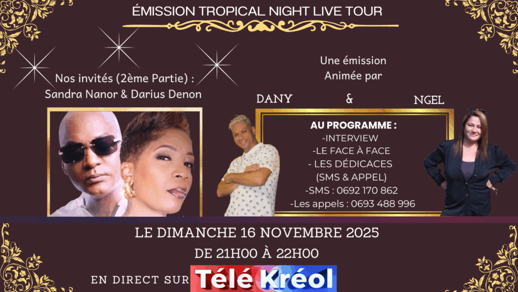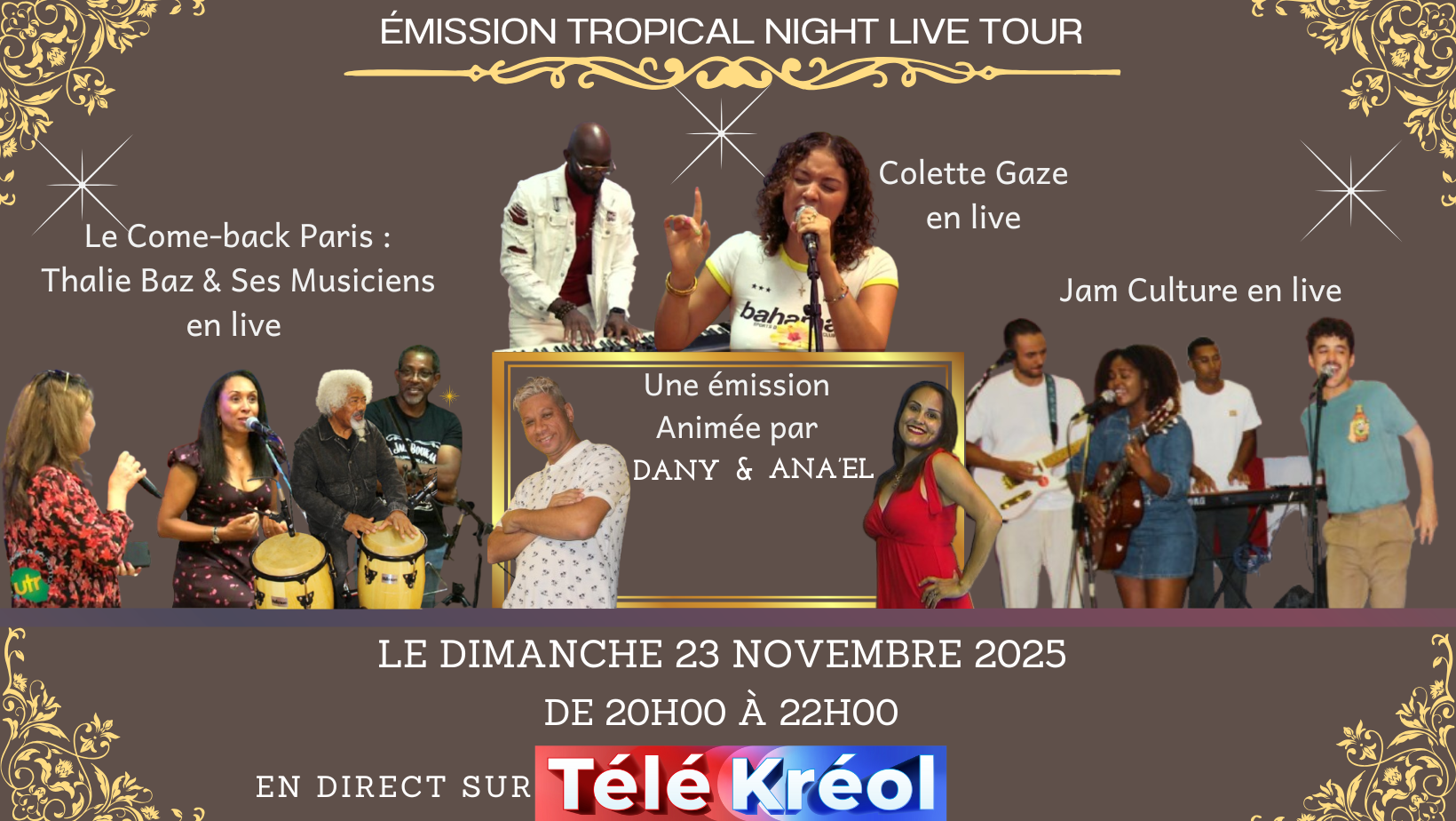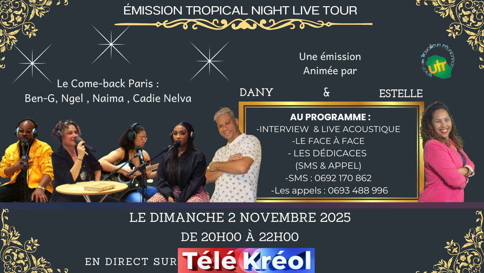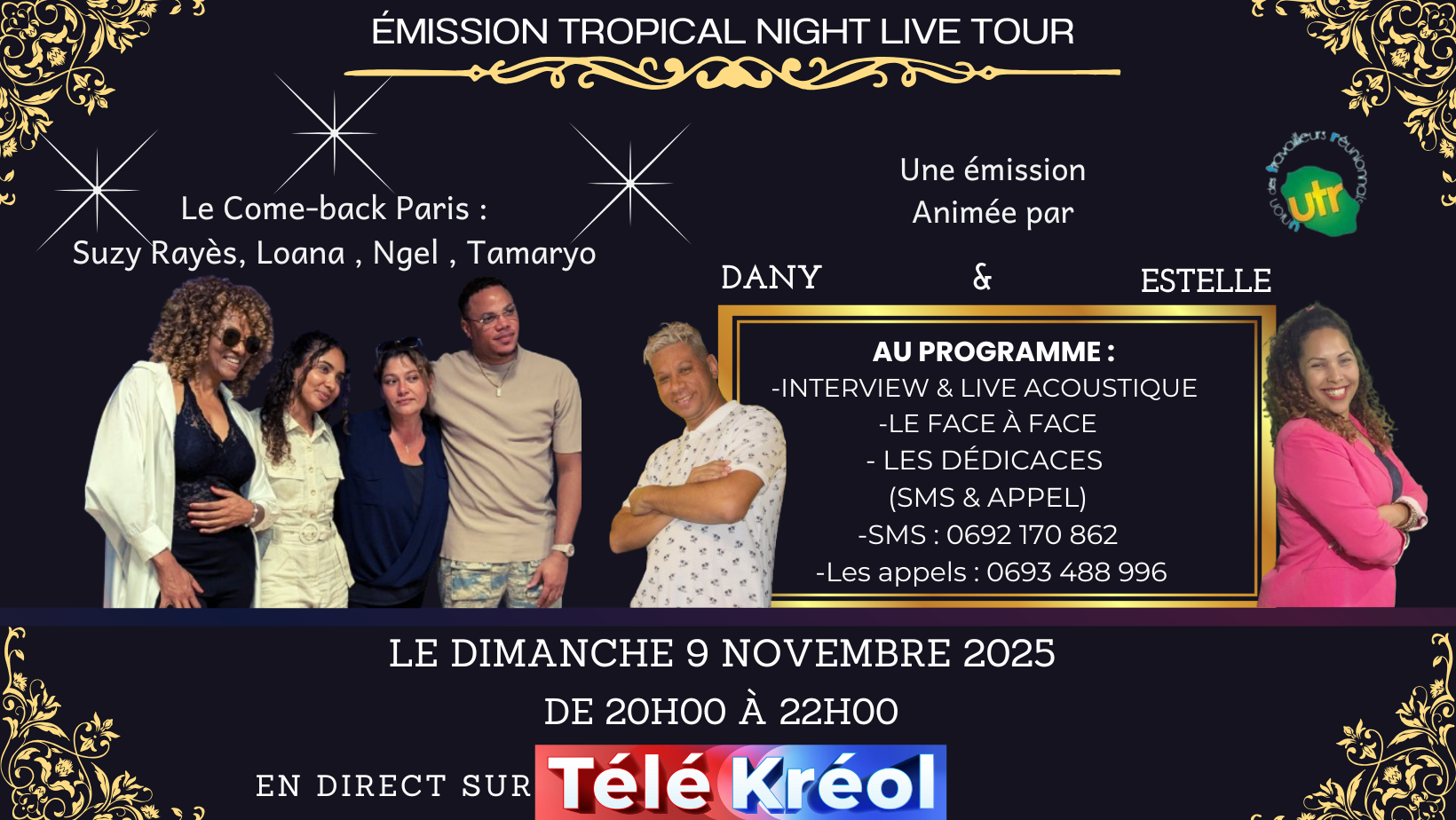 😍Retour en images dans Tropical Night Live Tour Emission du 17 août 2025, sur Télé Kréol, présentée par Dany et Erika & Jenny, depuis le studio de l’asso KILTIR’ARTHERAPIE.🌟Nous avons eu le plaisir d’accueillir Stéphanie Payet en live acoustique💫Le site officiel de ton émission : www.tropicalnight.re